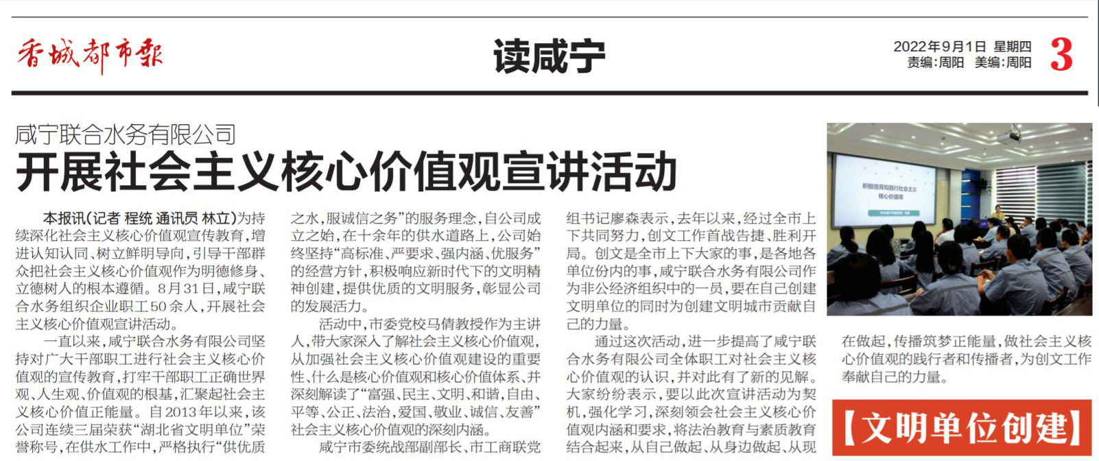 圖∶《香城都市報(bào)》刊登相關(guān)新聞 為進(jìn)一步推進(jìn)社會(huì)主義核心價(jià)值觀宣傳工作,提高公司職工精神文明素質(zhì)。8月31日,咸寧聯(lián)合水務(wù)有限公司與中共咸寧市委宣傳部、咸寧市工商聯(lián)共同開展“社會(huì)主義核心價(jià)值觀宣講”活動(dòng)。此次活動(dòng)由市委黨校馬倩老師主講,咸寧市委統(tǒng)戰(zhàn)部副部長、市工商聯(lián)黨組書記廖森、咸寧聯(lián)合水務(wù)有限公司總經(jīng)理毛雄輝等領(lǐng)導(dǎo)出席本次宣講活動(dòng)。