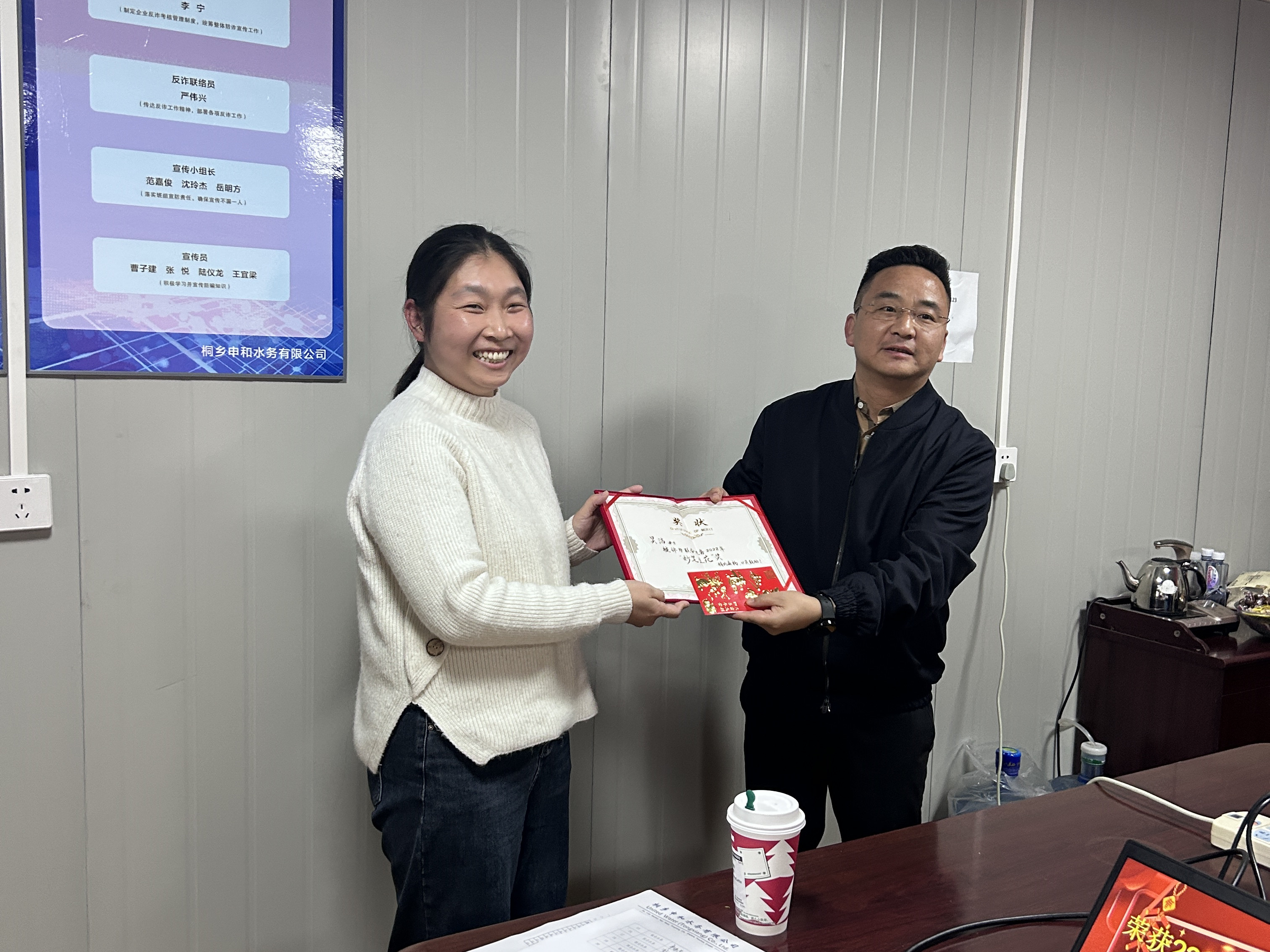 圖:羅總為吳潔頒獎(jiǎng) 會(huì)議隨著高級(jí)副總裁陳樵的精彩致辭迎來高潮。陳總表示,桐鄉(xiāng)作為聯(lián)合水務(wù)奮勇發(fā)展的中堅(jiān)力量,始終錨定目標(biāo),接續(xù)奮斗,匯聚了干事創(chuàng)業(yè)的強(qiáng)大合力。今年,公司涌現(xiàn)出一批工齡高達(dá)15年的優(yōu)秀員工,為此,他代表公司向?qū)⑶啻悍瞰I(xiàn)給公司的老員工們致以最誠(chéng)摯的感謝,希望他們保持對(duì)公司的熱忱,跟隨公司的腳步,乘勢(shì)而上。隨后,陳總代表公司為他們頒發(fā)了榮譽(yù)證書。 最后,聯(lián)合水務(wù)高級(jí)副總裁兼桐鄉(xiāng)公司總經(jīng)理羅斌作工作總結(jié),羅總從公司管理層的人員調(diào)整、安全生產(chǎn)、達(dá)標(biāo)提標(biāo)等方面進(jìn)行了全面回顧,并對(duì)2023年公司的穩(wěn)步發(fā)展做出展望。羅總表示,2023年是充滿希望的一年,公司全體員工勠力同心定能高效完成既定工作目標(biāo),開創(chuàng)公司發(fā)展新局面。
