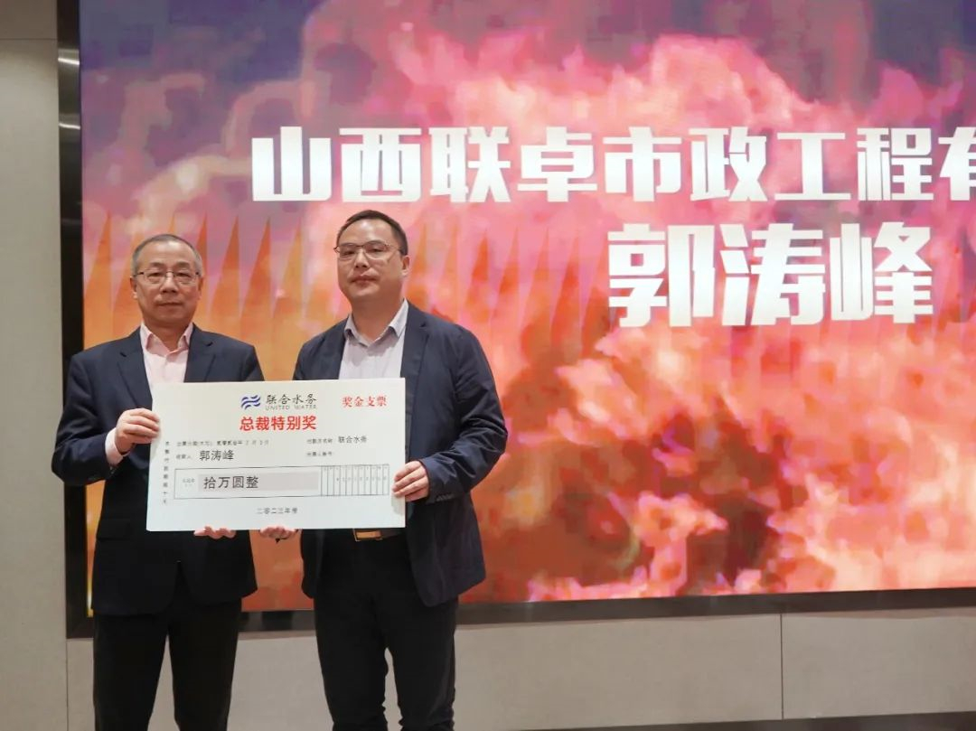 會議為建設管理中心副總經理兼任山西聯卓市政工程有限公司總經理郭濤峰頒發了“2022年度總裁特別獎”。2022年,郭總兢兢業業、勤懇奉獻,率領聯卓公司建設團隊出色完成了業績任務,為提升聯合水務經營業績和項目建設做出了貢獻。