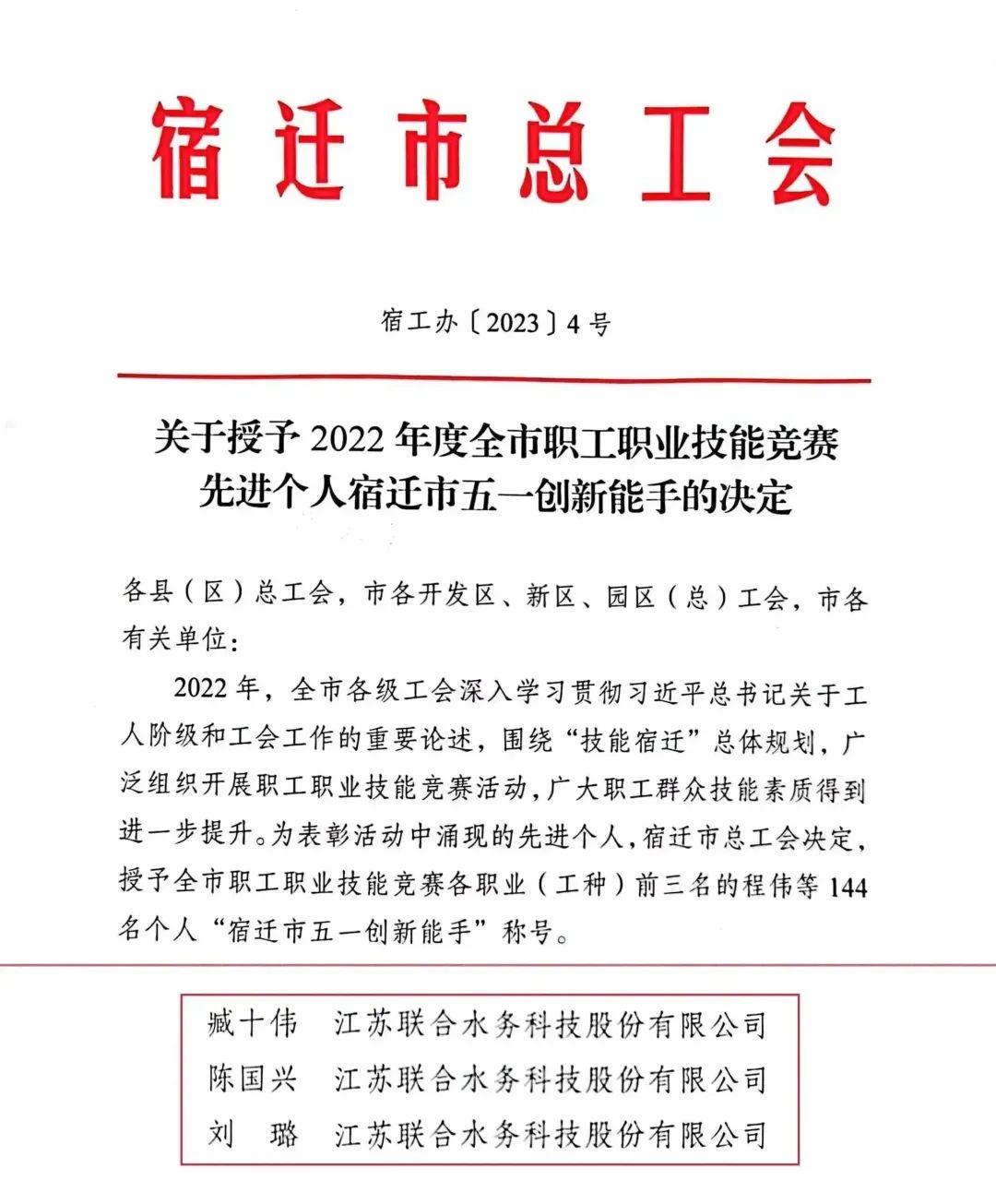 | 喜報!這些聯(lián)合水務(wù)人榮獲宿遷市“五一勞動獎?wù)隆焙汀拔逡粍?chuàng)新能手”榮譽稱號! | ||