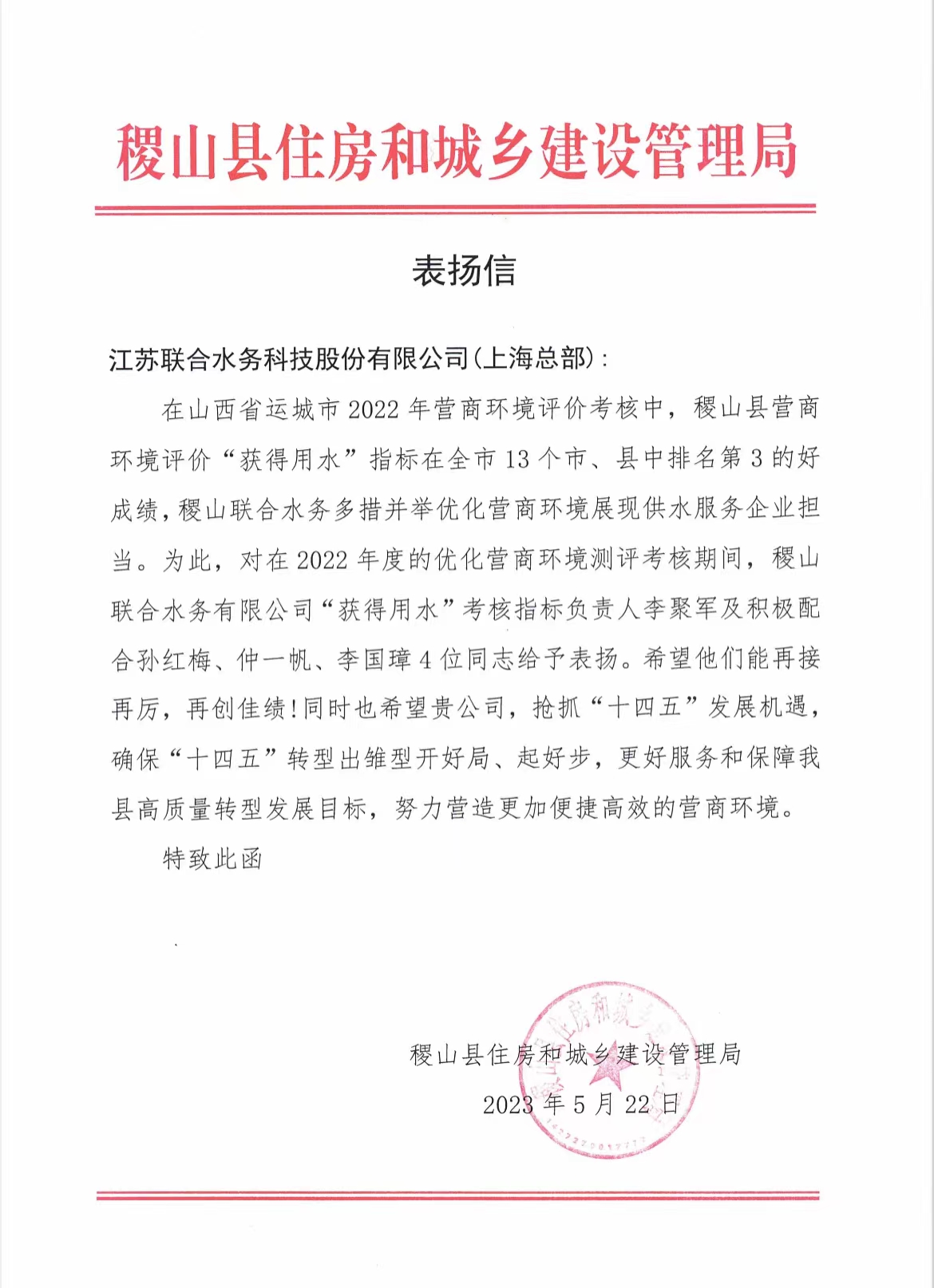 近日,山西省稷山縣住房和城鄉(xiāng)建設(shè)局向聯(lián)合水務(wù)發(fā)來(lái)一封表?yè)P(yáng)信,充分肯定了江蘇聯(lián)合水務(wù)科技股份有限公司旗下全資子公司稷山聯(lián)合水務(wù)有限公司在優(yōu)化營(yíng)商環(huán)境方面所采取的多項(xiàng)舉措,贊揚(yáng)其追求卓越,以高度責(zé)任感展現(xiàn)了供水服務(wù)企業(yè)擔(dān)當(dāng),信中特別表?yè)P(yáng)了稷山公司“優(yōu)化營(yíng)商”小組成員,包括客戶服務(wù)經(jīng)理李聚軍、客戶服務(wù)部副經(jīng)理孫紅梅、管網(wǎng)部經(jīng)理仲一帆、項(xiàng)目部經(jīng)理李國(guó)璋,希望他們能再接再厲,再創(chuàng)佳績(jī)!