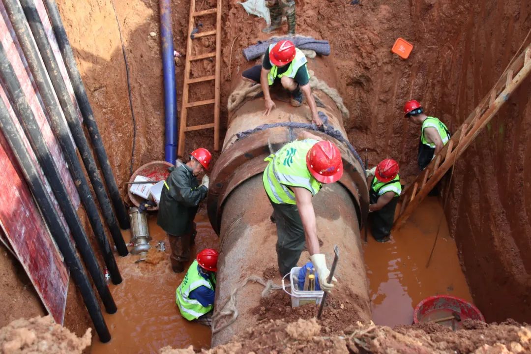 無懼“高”溫,做好應(yīng)急搶修 夏季作為一年之中的用水高峰期,季節(jié)的特殊性使得管道爆管、漏水現(xiàn)象發(fā)生頻率較高,供水管道搶修量比其他時(shí)間段明顯增加。7月12日,通江大道大屋吳附近DN1200mm供水管網(wǎng)因老化發(fā)生漏水,咸寧聯(lián)合水務(wù)多部門聯(lián)動火速趕赴現(xiàn)場了解情況,并迅速啟動應(yīng)急搶修預(yù)案,第一時(shí)間緊急調(diào)配挖掘機(jī)、發(fā)電車、抽水機(jī)等大型搶修機(jī)具進(jìn)行增援,安排應(yīng)急搶修專班趕往事發(fā)現(xiàn)場,迅速開展現(xiàn)場勘察、確定漏點(diǎn)具體情況、設(shè)立全面安全防護(hù)措施等搶修前期工作。在搶修期間,面對管徑大、時(shí)間緊、施工作業(yè)環(huán)境復(fù)雜等諸多難題,搶修人員齊心配合、攻堅(jiān)克難,井然有序地開展漏點(diǎn)測定、降水開挖、焊接維修、沖洗試壓等一系列搶修和恢復(fù)工作,天氣炎熱,施工人員早已汗流浹背,但他們不畏艱難酷暑,堅(jiān)守崗位,歷經(jīng)三十六個(gè)小時(shí)的晝夜奮戰(zhàn),完美完成DN1200主管道的維修和保養(yǎng),未對城區(qū)供水造成任何不良影響。