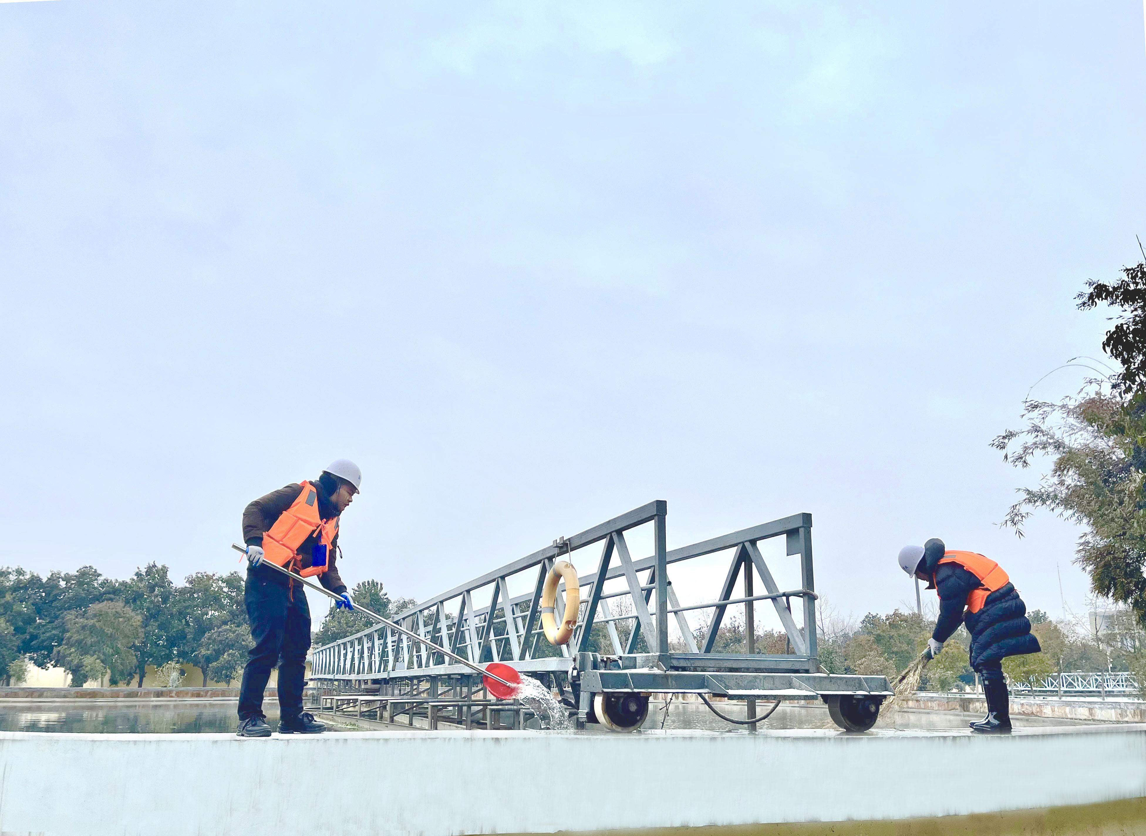 為了讓二沉池盡快運轉,在等待水泵安裝的過程中,朱總和葉廠長冒著寒風雨雪帶領生產部和機電部的同事,人工清理軌道上的凍雪。大家穿上救生衣,戴上安全帽和防護手套等用品,準備了多種工具,嘗試著幾種討論的方案。先用鐵鍬鏟鑿冰面,卻發現冰層又堅硬又滑鏟不動。又換成水瓢舀水用鐵鍬鏟,發現效率不高且積水過多容易結冰。經過反復嘗試嘗試驗,最終選用兩人分工合作,前面的人用水瓢舀水,后面的人用快速把掃的方式。大家兩兩一組分布在四個池子清掃。不知不覺中寒風將被濺的水珠和雨雪吹成了一顆顆冰粒,落在大家身上。眾人顧不得修整,一圈接著一圈的打掃著,最終機器成功繼續運轉起來。同時水泵也安裝完成,打開電源后,正如大家預想的那樣,前方水管不斷沖刷融化冰面,后面轉動的輪子就不會打滑。隨著四個水泵的接入,四個二沉池全部正常運轉起來。