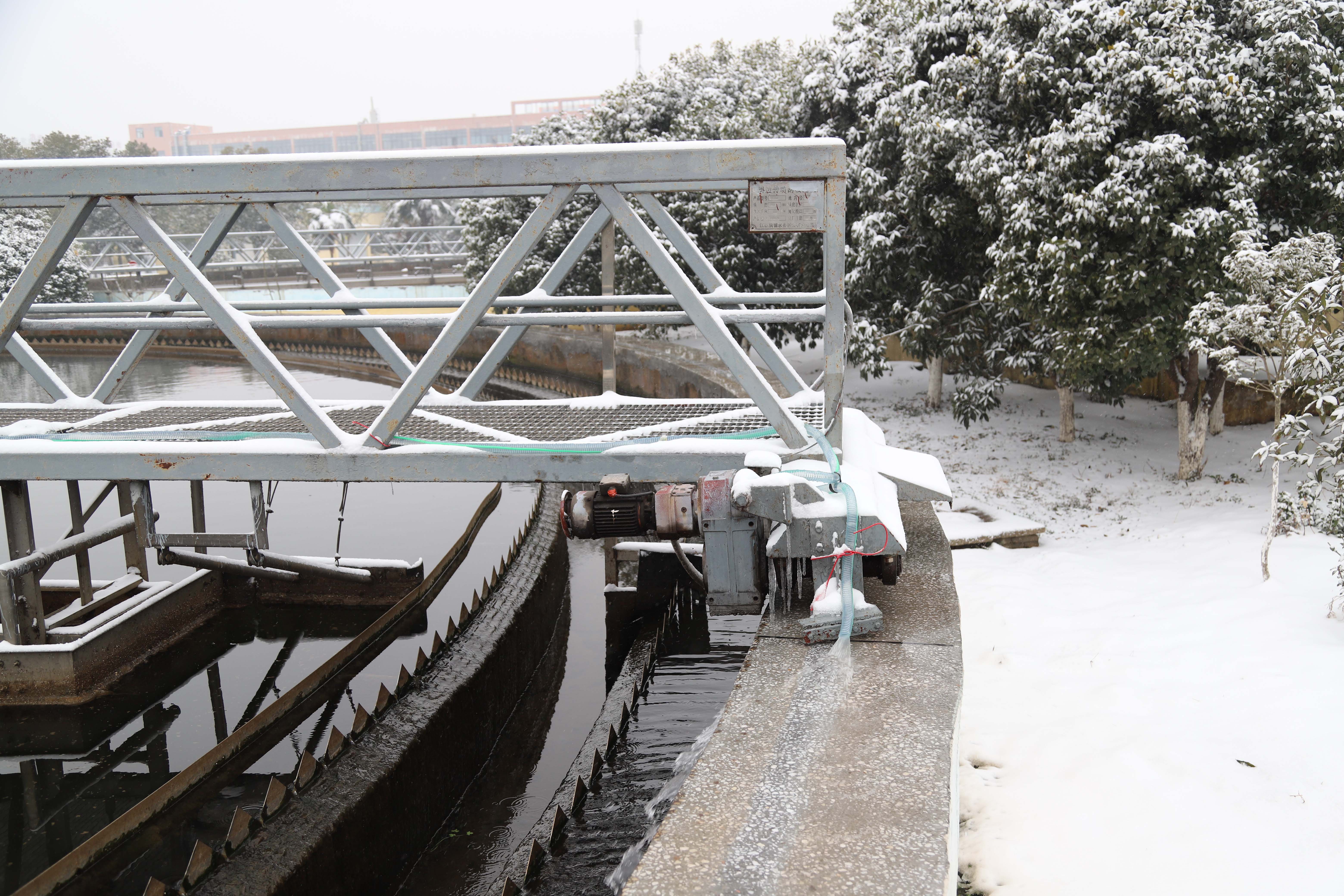 污水處理工作不僅關系著生態環境,也是關系著千家萬戶的民生大事,寒潮天氣下,隨州公司生產人員冒著風雪進行重點地巡檢,通過巡檢觀察污水處理廠各工藝單元的感官現象和指標,初步判斷水質的變化和運行是否正常、穩定,重點設備是否正常運行。在巡檢的過程中,生產人員發現一期四座二沉池下方輪子出現打滑空轉,二沉池運轉停止的情況。雪落在行走軌道上,被行走輪壓實后,形成雪層,造成行走輪的打滑,使刮泥機長時間在一個位置運行,池底的污泥無法全部排出,造成工藝運行的異常,需要及時清理干凈軌道表面的冰層。發現問題后,生產各部門緊急召開臨時會議,制定解決方案,最終決定安裝水泵,從池子抽水澆注在軌上道,保障軌道正常運行。