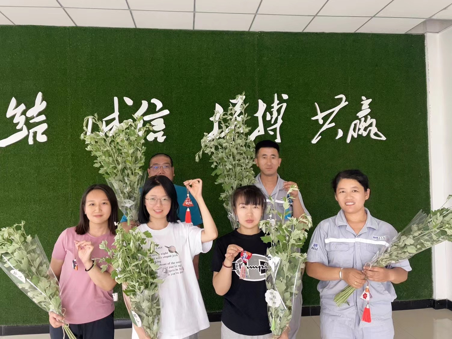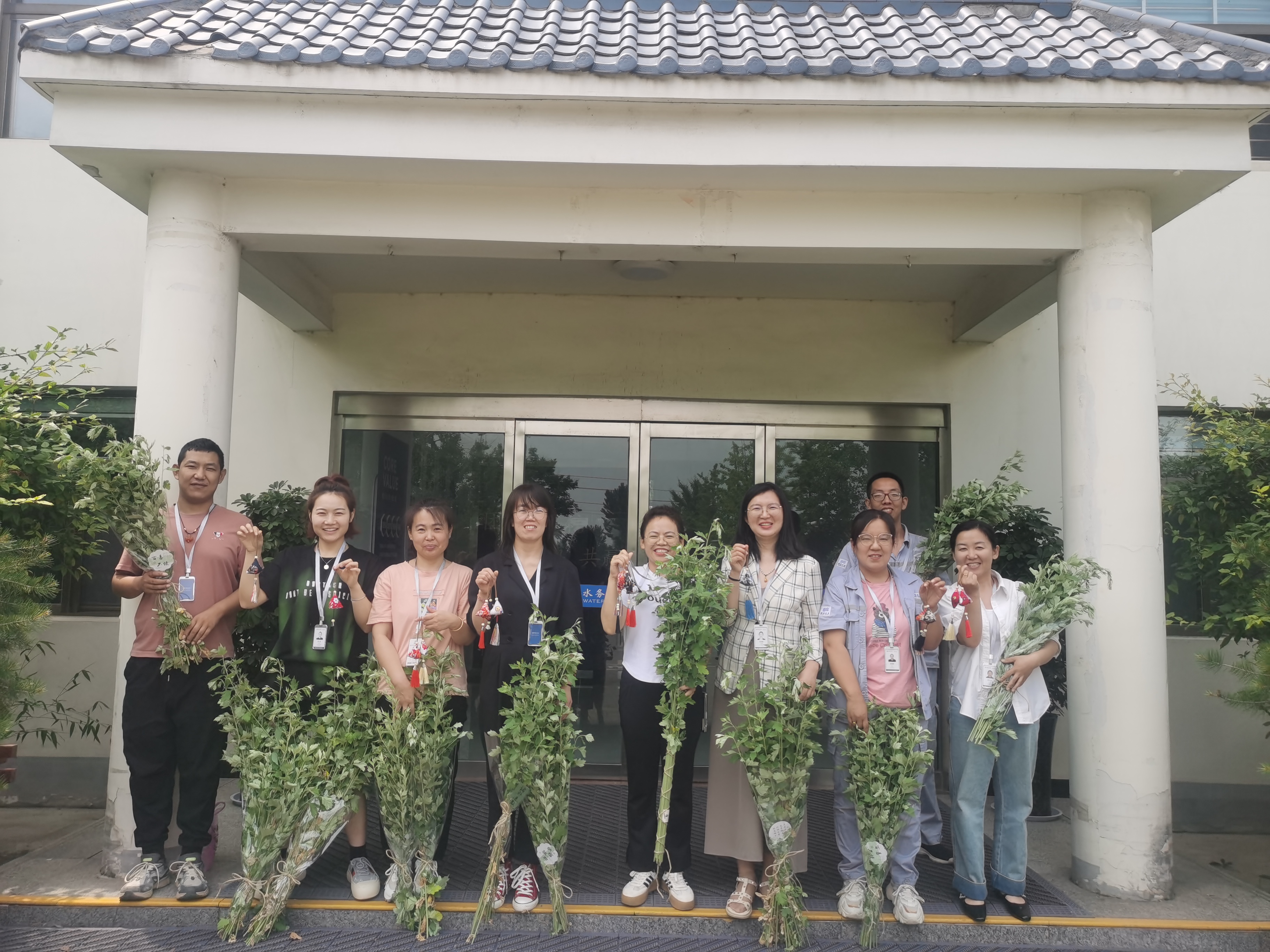 艾草花束 沒有一個節(jié)日的儀式感是一束花所給不了的,端午節(jié)也不例外。此次活動大家就地取材,公司員工提前挖出園里的新鮮艾草、用剪刀修剪艾草的長度和形狀,制造層次感。并將包裝紙裹在艾草根部,用麻繩固定。在花束上綁上各式的小卡片或小裝飾品。一束束飽含吉祥象征的端午花束就做好了。制作現(xiàn)場大家互幫互助互敬互贈,彼此將美好的祝福及心意連同花束一同贈予。倒掛的艾草花束,傳遞出的是納福驅(qū)邪,祝福安康的美好寓意,也是團隊協(xié)作之美的彰顯。