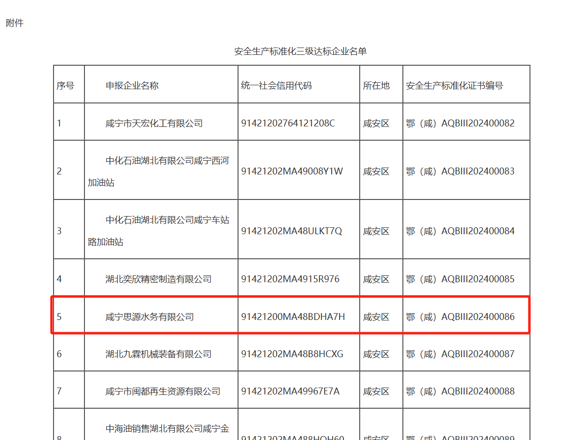 近日,聯(lián)合水務(wù)旗下子公司咸寧思源水務(wù)有限公司順利獲得了由咸寧市應(yīng)急管理局頒發(fā)的“安全生產(chǎn)標準化三級企業(yè)”證書,此項榮譽的獲得,標志著公司安全生產(chǎn)管理工作得到充分肯定。