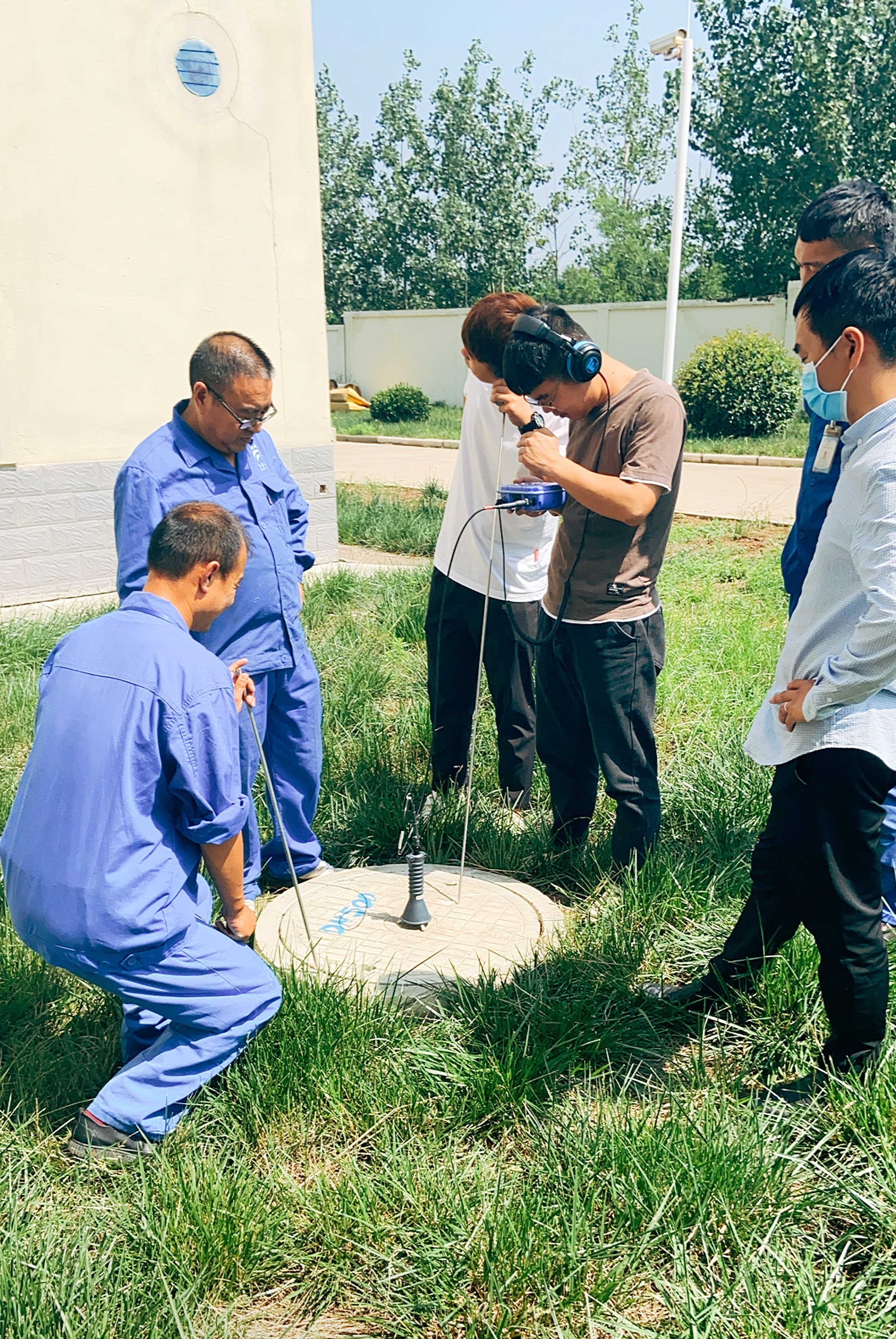 培訓過程中,廠家技術人員帶領學員們在廠內結合管網(wǎng)材質、管線分布和水壓情況,安排學員逐個使用聽漏工具對不同管材及閥門進行“聽診”,隨后帶領學員到大唐廠前生活區(qū)和職教園區(qū)供水管道進行實地演練。