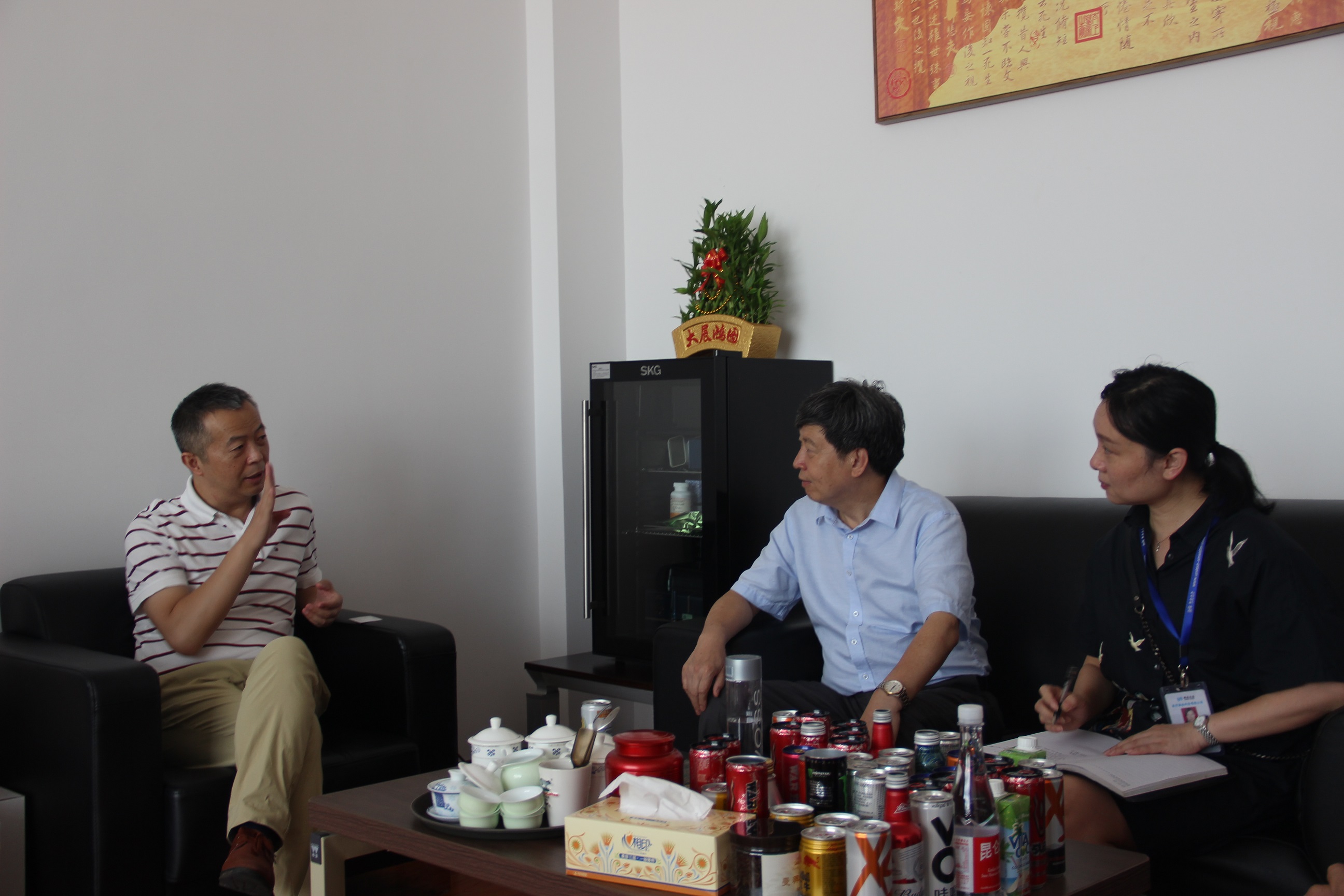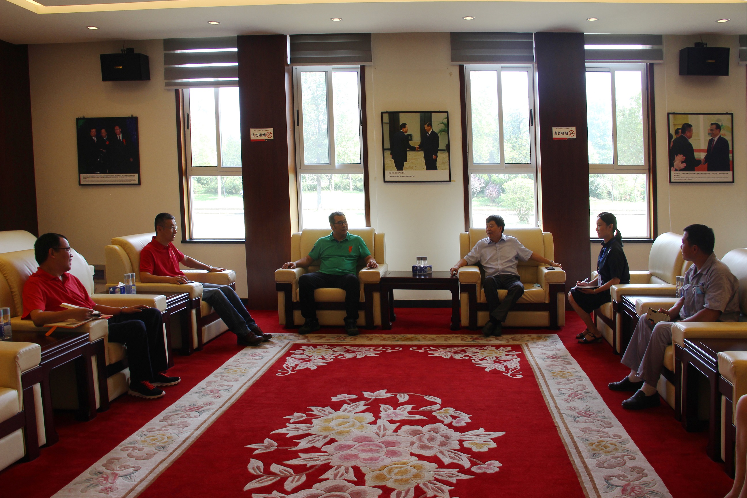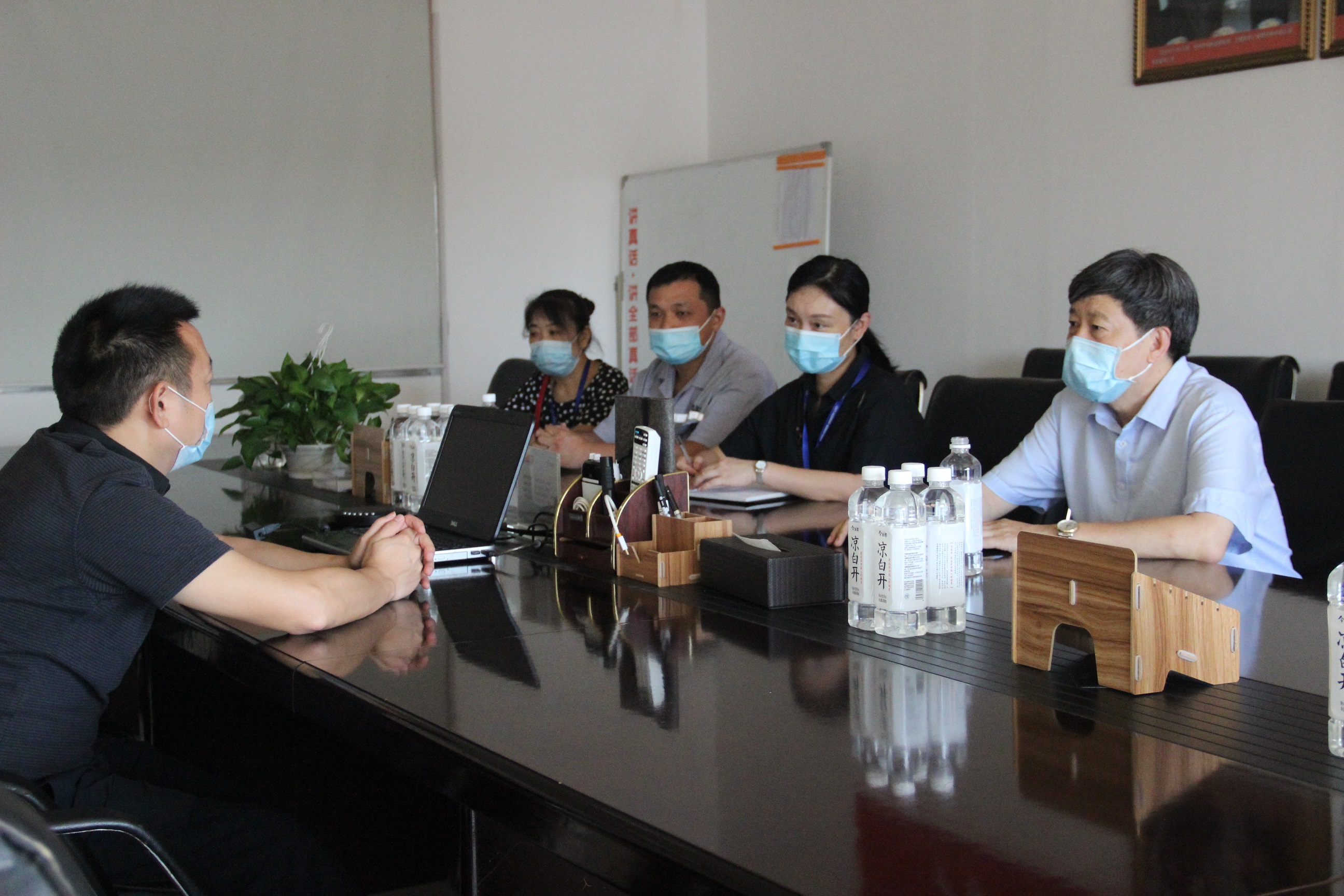 圖3:走訪奧瑞金企業 冒著炎炎烈日,毛總一行來到奧瑞金,與總經理于仙超進行了親切洽談。奧瑞金雖然是近幾年才落戶咸寧發展,但是作為一家飲料公司,對水質的要求非常嚴格,值得欣喜的是咸寧聯合水務的水質完全能滿足公司要求,無論是水量或是水壓,都可滿足平時生產需要。在談到對供水服務工作有何建議時,于總說,企業的發展壯大并非一日之功,與聯合水務的合作非常愉快,希望聯合水務能持續保持現在的高標準、嚴要求的供水態度,為確保企業發展提供堅實后盾。