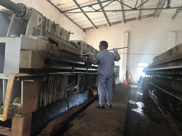 圖3:生產部水區運行工正在巡查設備 赤膊上陣, “桑拿房”竭盡全力壓泥卸料 荊州項目公司是工業廢水綜合污水處理廠,因工業廢水水質雜,以致進入污水處理系統后產生的污泥成分復雜,污泥量大。系統產生的污泥經過調理罐加藥調理絮凝、低高壓螺桿泵進料、板框壓濾機壓榨、卸料這一系列程序后才能拖運至污泥焚燒單位進行后續處置。為了保證后續工作正常開展,泥區運行工需做到當日泥當日清。 污泥脫水間在太陽炙烤下儼然就是溫度高達40℃的“桑拿房”,泥區運行工需要在充滿窒息氣味的“桑拿房”內竭盡全力壓泥卸料,由于工作服被汗水濕透,貼于身體施展不開,不得不赤膊上陣。面對這嚴酷的“烤”驗,他們無懼無畏、奮勇向前、迎難而上。