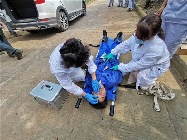 圖2:應(yīng)急演練現(xiàn)場--醫(yī)護人員查看傷員情況 總指揮迅即趕到事故地點統(tǒng)籌指揮,應(yīng)急小組多措并舉,疏散現(xiàn)場閑雜人員、布置警戒線、通知救援小組展開救護工作、撥打120急救電話,各項工作緊張而有序開展。救援隊長了解事故大致情況后,安排人員在現(xiàn)場安裝大功率通風(fēng)設(shè)備進(jìn)行通風(fēng)處理,并開展初期救援,2分鐘后,公司專業(yè)救援人員佩戴便攜式防毒面具、安全帶,攜帶檢測儀器、對講機,連接救生索,入池檢測氣體濃度,評估下池救援的可行性。在確認(rèn)可以施救的情況下,將傷員轉(zhuǎn)移至池外通風(fēng)空曠處,隨即按標(biāo)準(zhǔn)心肺復(fù)蘇手法實施搶救,直至120救護車趕到。專業(yè)醫(yī)護人員查看傷員情況后將其轉(zhuǎn)移至救護車上,送往醫(yī)院搶救治療。至此,經(jīng)過精心策劃、周密安排的應(yīng)急演練圓滿落下帷幕。