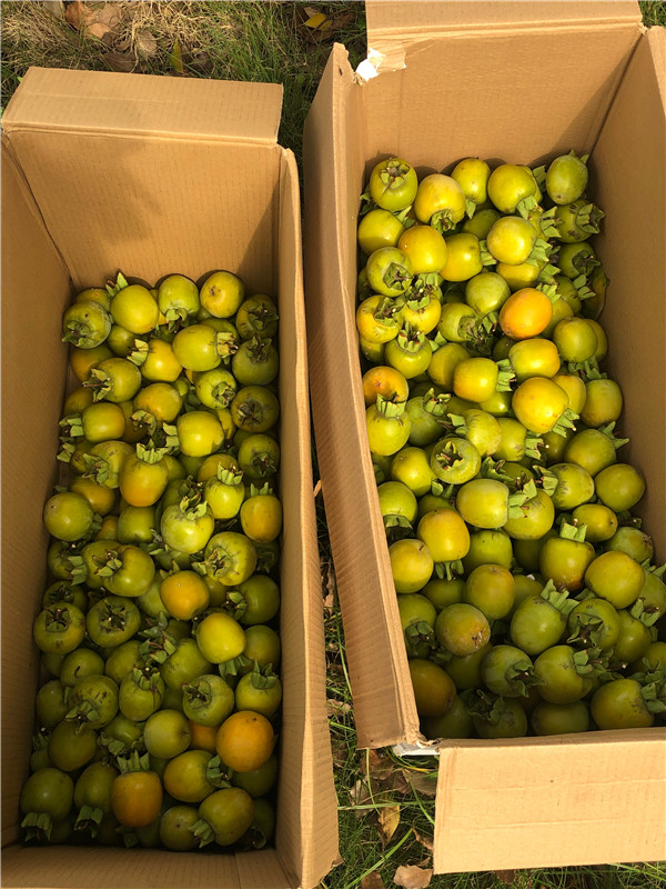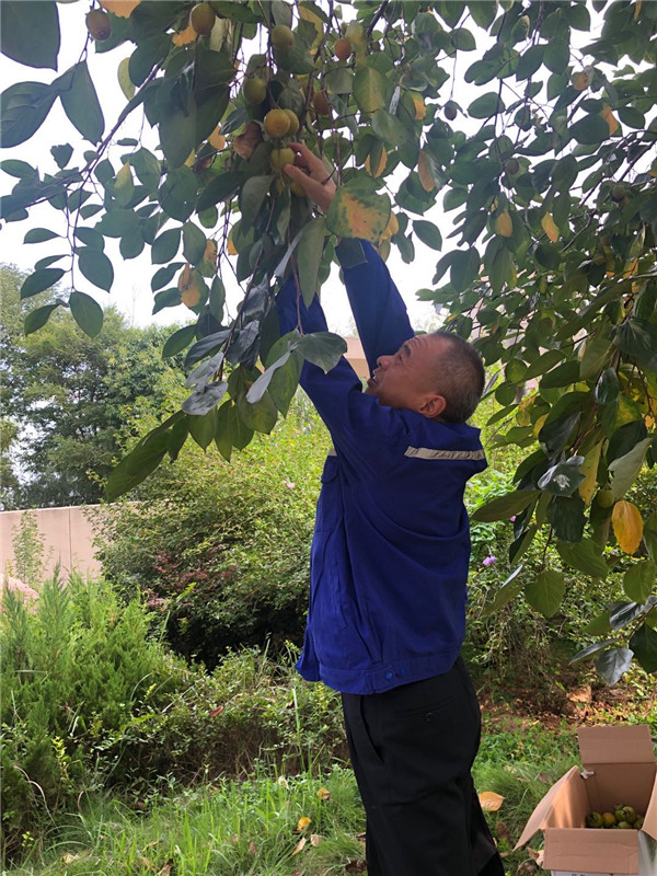 在鄭總的一聲令下,今年的“摘柿節(jié)”正式拉開(kāi)序幕。也許是中午加餐了的原因,大家都是干勁十足。一開(kāi)始都是踮起腳尖圍著被柿子壓彎的樹(shù)枝摘,很快踮起腳尖能夠得著的柿子都被摘干凈了,但馬上就有人找來(lái)了兩張椅子墊著摘。一個(gè)人摘,一個(gè)人抱著紙箱接著,生怕碰壞了一丁點(diǎn)兒,配合得極其融洽。沒(méi)過(guò)一會(huì)兒,墊著的椅子也不夠高了,這個(gè)時(shí)候就需要一兩名“勇士”了。張廠長(zhǎng)和童哥自靠奮勇爬到樹(shù)上,瘋狂地收割著今年的“成果”。樹(shù)下的人也沒(méi)閑著,舉起長(zhǎng)長(zhǎng)的網(wǎng)兜接著剛摘下來(lái)圓鼓鼓的柿子。采摘進(jìn)行得非常順利,陽(yáng)光下,大家一個(gè)個(gè)都笑得合不攏嘴。有人上樹(shù),就有人接著柿子,有人爬梯子就有人扶,有柿子掉地上,立馬就有人去撿。一個(gè)多小時(shí)的時(shí)間,竟然摘了整整五大箱。柿子樹(shù)下一片祥和的畫面,不身在其中很難體會(huì)到這種美好!
