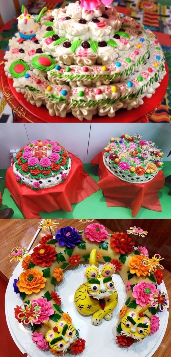 古絳州,今天的新絳縣,一直是山西省重要的小麥、棉花產地。麥收時節,家家戶戶收麥、晾曬,用上等的小麥磨成面粉。每逢年歲時節、絳州民間面塑形態各異、花色絢麗,又被當地人稱為“花饃”。因民俗而出現的面塑則代代相傳、生生不息,經過幾千年的傳承和經營,成為中國傳統文化和民間藝術的一部分。春節,講究“大門獅子二門狗”,寓意鎮宅保平安;水缸旁放“雙頭魚”,寓意連年有余;糧倉放牛拉車和麥囤,寓意糧倉滿溢、日子越過越景氣;天地爺處祭棗山花饃、豬羊饃、節節高饃,寓意殺豬宰羊、生活一年比一年好;財神爺處祭元寶棗籃饃,寓意招財進寶。清明時節,要捏豬頭饃、刺魚饃等祭祖掃墓,刺饃還得在墳頭滾一滾,意為已故祖先撓癢癢,盡兒孫之孝。端午節,要捏老虎饃,“虎鎮五毒”,寓意去災辟邪;槎Y上,要捏龍鳳糕,插柏葉,紅繩系核桃、紅棗、花生、石榴、寓意夫妻百年好合、發家致富、生兒育女。新生兒滿月時,要蒸各式各樣的花、果造型的花饃、寓意開花結果。壽誕時、兒女要為長輩蒸壽桃饃。為母親拜壽時,插一組“七仙女拜壽”,為父親拜壽時,插一組“八仙慶壽”,顯示兒女孝心。在這片土地上,自漢代以來流傳千年的捏花饃風俗,早已深深融入絳州人們生活的方方面面。只要有誰家遇上紅白事,鄰居、親戚都會聚集在一起幫忙蒸制花饃。