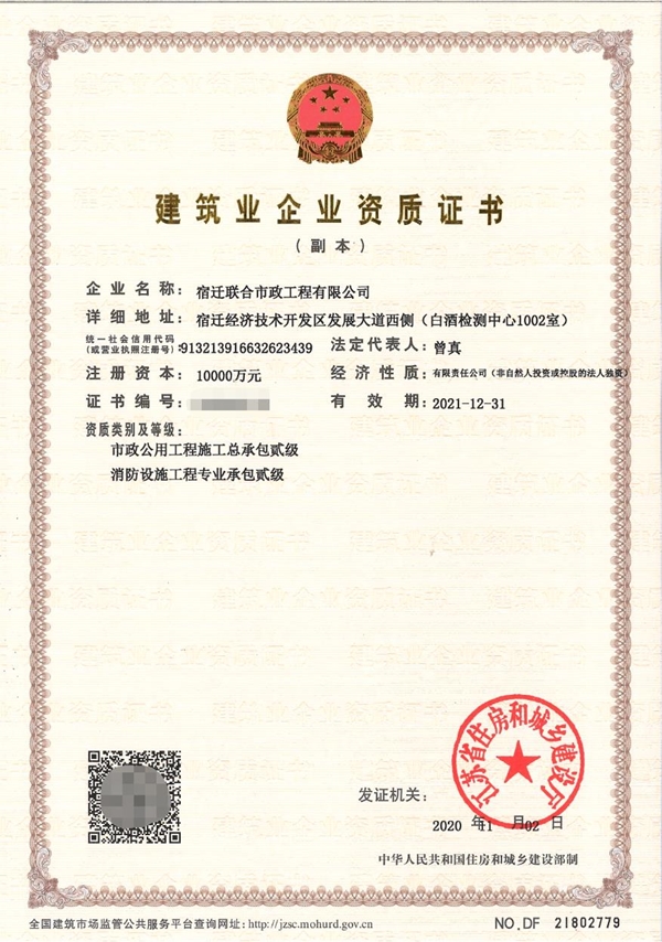 近日,宿遷聯合市政工程有限公司成功取得了新一期安全生產許可證,標志著公司市政公用工程資質證書延續換證工作圓滿完成。
