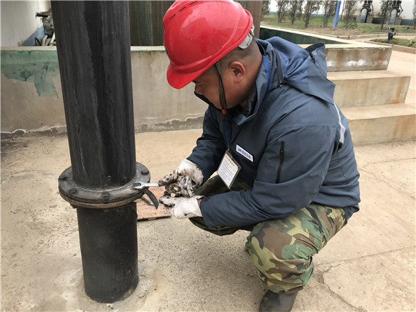 圖/ 機(jī)電人員正在檢修設(shè)備 聯(lián)合出擊,保障出水穩(wěn)定達(dá)標(biāo)排放 在冬季低溫天氣下,因生活污水本身進(jìn)水溫度較低,微生物活性下降,導(dǎo)致污水中總氮去除率降低,需投加碳源以增加污泥濃度的同時(shí)嚴(yán)格控制溶解氧,保證出水總氮濃度達(dá)標(biāo)。生產(chǎn)部運(yùn)行工每天分三次投加碳源,每小時(shí)巡查污水中氧的溶解量并實(shí)時(shí)調(diào)控,以保證出水溶解氧控制在2.5~3mg/L之間。