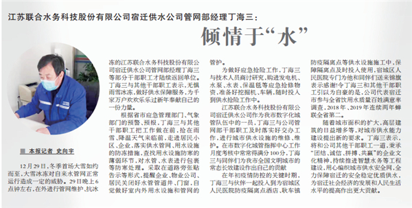 恰逢陽歷新年前夕,大戰寒潮之時,宿遷供水公司管網部經理丁海三被《宿遷日報》專版約訪并報道,這是一份屬于聯合水務供水人的榮耀。