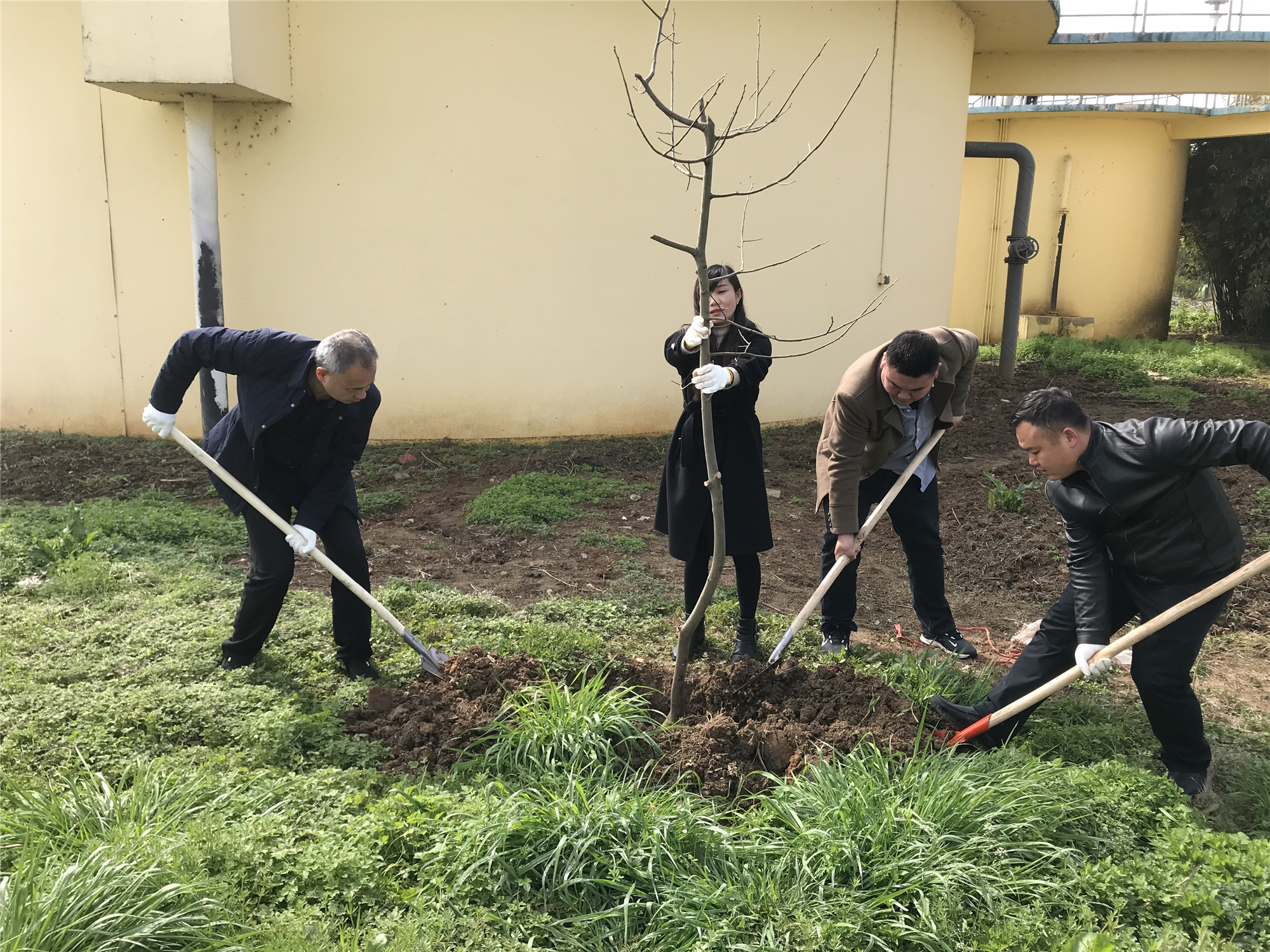 本次植樹的地點主要集中在二沉池、儲泥池、公司大門附近這三大區域,鄭總對人員進行了合理化片分工,由管委會三位領導帶隊負責。采購回的棗樹、梨樹、桃樹、桔樹、桂花樹、柿子樹、櫻花樹、花椒樹、梔子花樹等百余棵樹苗放置在各區域待栽。在各自領導的帶領下,大家分頭來到各自負責的片區有條不紊地干了起來。大家操作著鋤頭、鐵鍬、膠桶等工具,挽起衣袖,挖坑、放樹、扶苗、回填、培土、踩實、澆水、覆土,嚴格按照領導提示的“三埋、兩踩、一輕提”的要領,耐心細致地種植每一棵樹苗。大家分工合作、配合默契,每道工序都做的十分認真,到處都是一片熱火朝天、干勁十足的勞動場景。隨后大家還順手清理了附近的垃圾和雜草,為環境的美化,又盡了一份心力。經過兩個小時的勞動,今年植樹節圓滿結束。