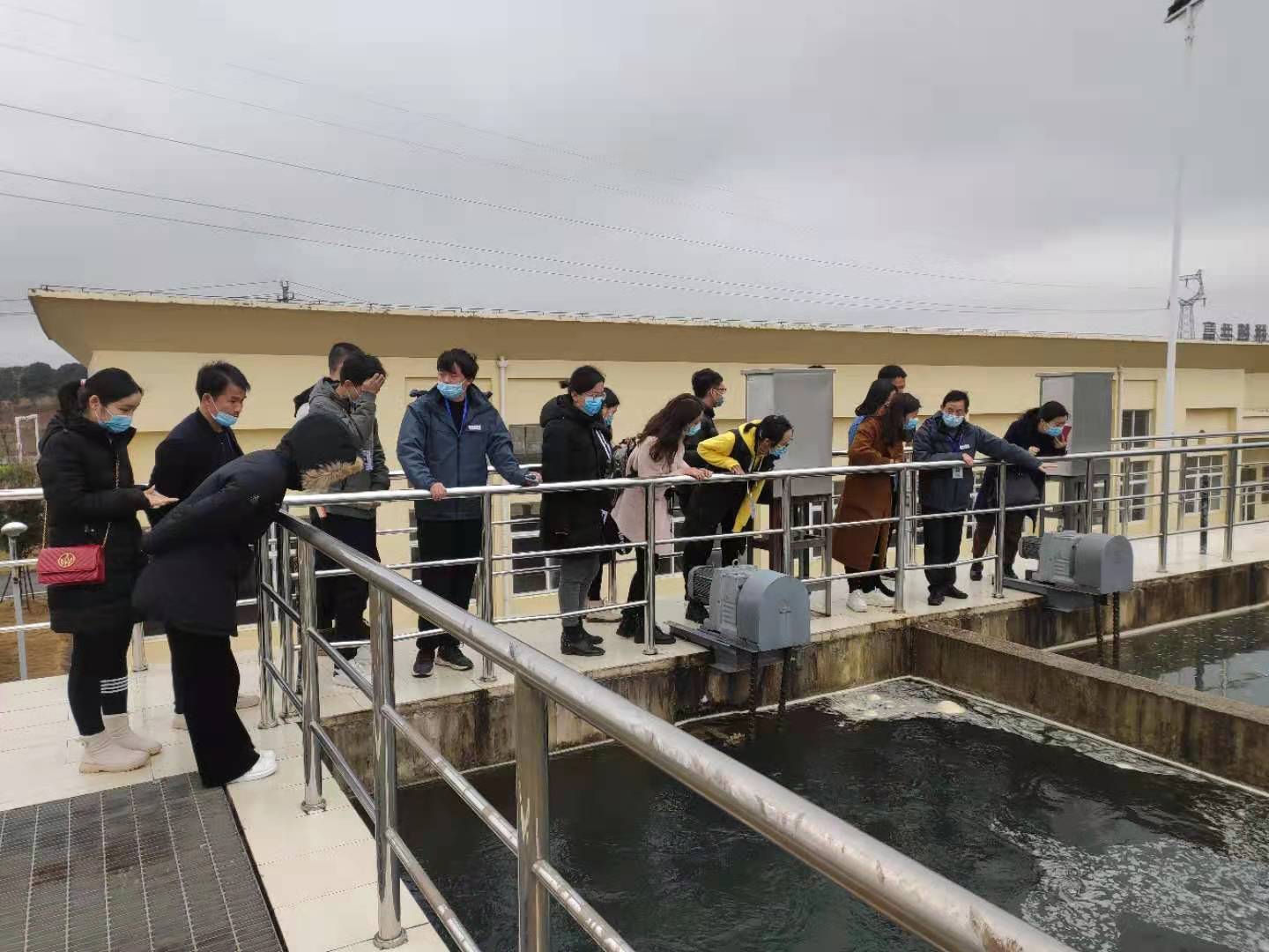 黃經理在王英水廠門口迎接大家,指引大家按照疫情防控要求測溫、消毒、檢查口罩。隨后按照“絮凝、沉淀、過濾、消毒”生產工藝流程帶大家觀看每一個生產環節并詳細介紹生產工藝。接著又帶新員工分別到調度中心、香泉水質檢測中心參觀,讓新員工了解調度與水質檢測工作。