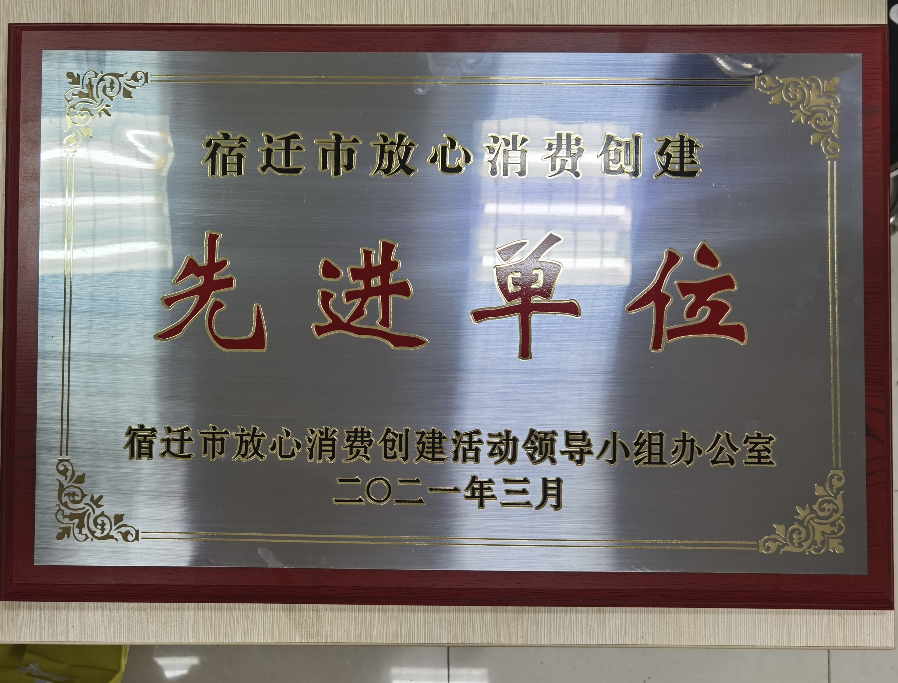 圖:“宿遷市放心消費創建先進單位”獲獎證書