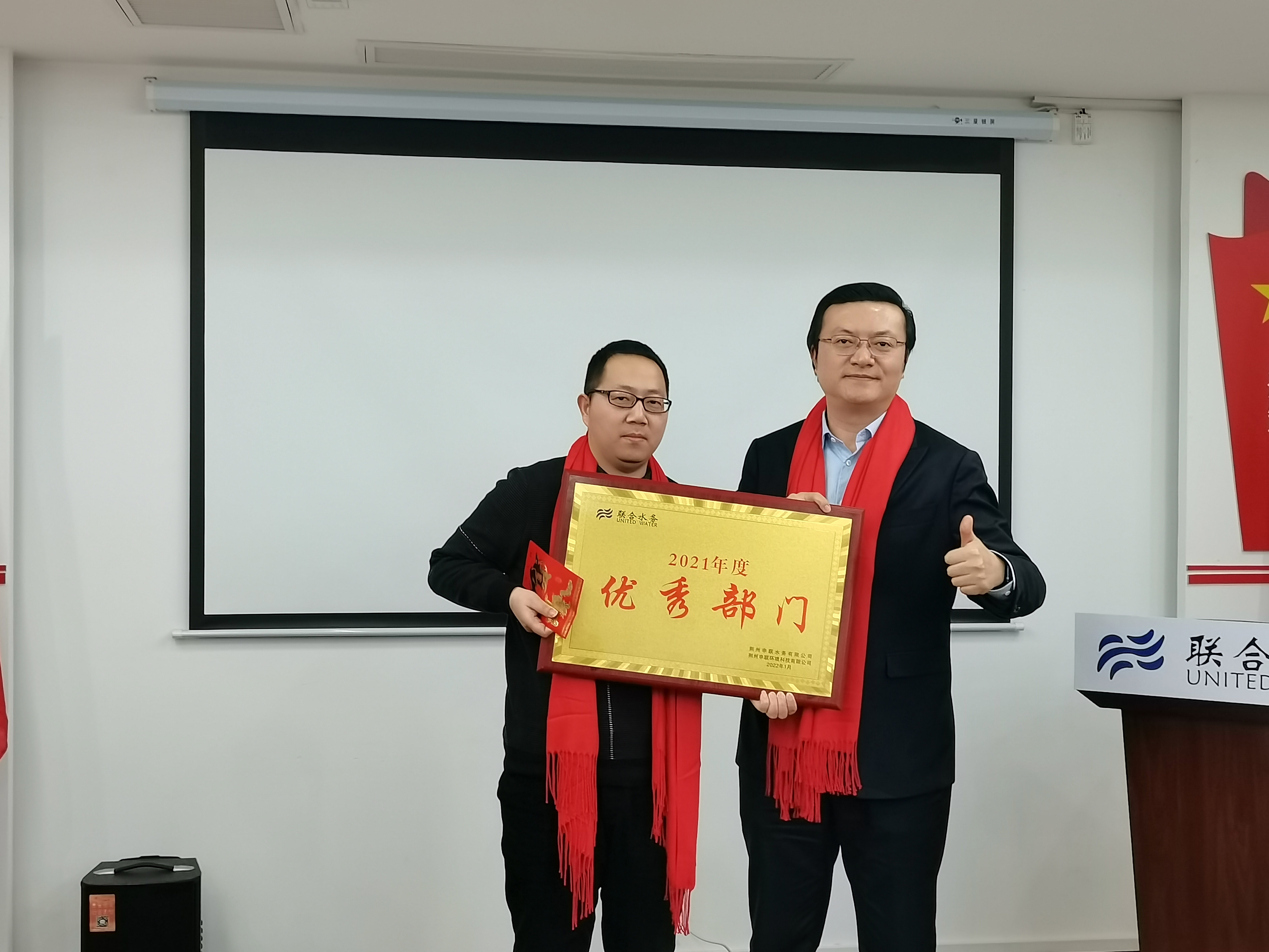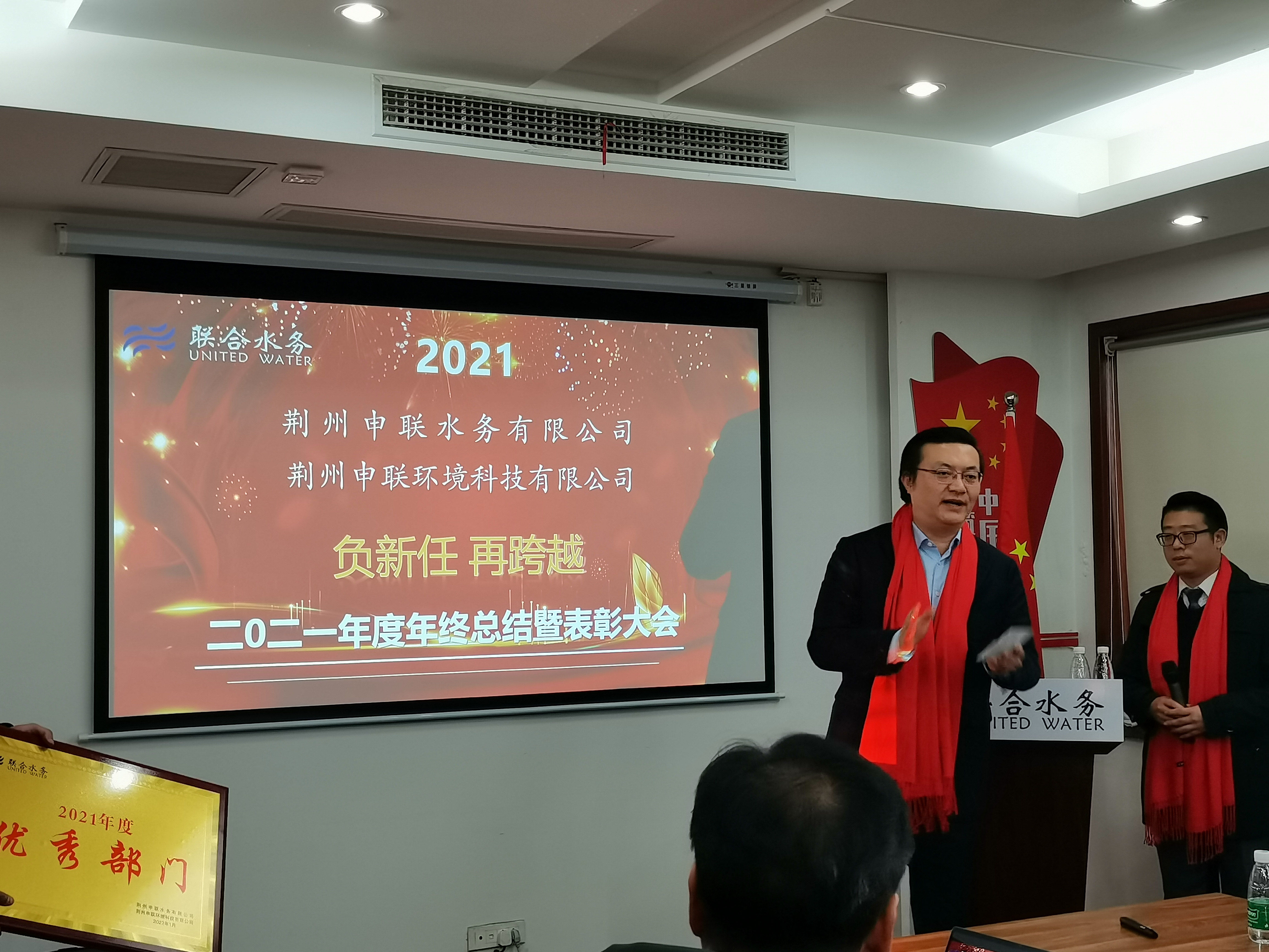 圖:聯(lián)合水務(wù)常務(wù)副總裁劉猛為優(yōu)秀部門(mén)頒獎(jiǎng) 會(huì)議最后,江蘇聯(lián)合水務(wù)科技股份有限公司常務(wù)副總裁劉猛作重要講話。首先,劉總代表總部對(duì)荊州公司2021年取得的驕人業(yè)績(jī)表示祝賀,對(duì)荊州公司全體員工所付出的努力表示衷心的感謝。隨后,劉總用三點(diǎn)感受綜合表述荊州公司取得的成績(jī)、面臨的挑戰(zhàn)以及發(fā)展的方向。一是擁抱變化,荊州公司全體員工以更加積極飽滿(mǎn)的熱情擁抱變化,以更加敬業(yè)的精神對(duì)待工作,加上管理團(tuán)隊(duì)更加規(guī)范、精細(xì)的管理,才取得了優(yōu)異的成績(jī);二是挑戰(zhàn)自我,雖然面臨設(shè)備老舊、出水達(dá)標(biāo)、業(yè)務(wù)拓展、新的業(yè)績(jī)考核指標(biāo)等多重挑戰(zhàn),但荊州公司各部門(mén)團(tuán)結(jié)一心,求大同存小異,朝著完成下達(dá)的目標(biāo)不懈努力;三是創(chuàng)造價(jià)值,一方面在提標(biāo)升級(jí)改造項(xiàng)目竣工前,在產(chǎn)能、工藝雙受限的基礎(chǔ)上,盡量接納更多的污水,為荊州市節(jié)能降碳貢獻(xiàn)力量,為社會(huì)創(chuàng)造價(jià)值;另一方面,以“我不負(fù)公司,公司定不負(fù)我”的積極心態(tài)繼續(xù)開(kāi)源節(jié)流,努力打破污水處理廠圍墻邊界所帶來(lái)的限制,全方位拓展新業(yè)務(wù),勇于開(kāi)拓、勇于創(chuàng)新,為公司創(chuàng)造價(jià)值。最后,劉總希望大家在虎年虎虎生風(fēng),為荊州公司、為聯(lián)合水務(wù)創(chuàng)造更多的價(jià)值、創(chuàng)造更好的業(yè)績(jī)。