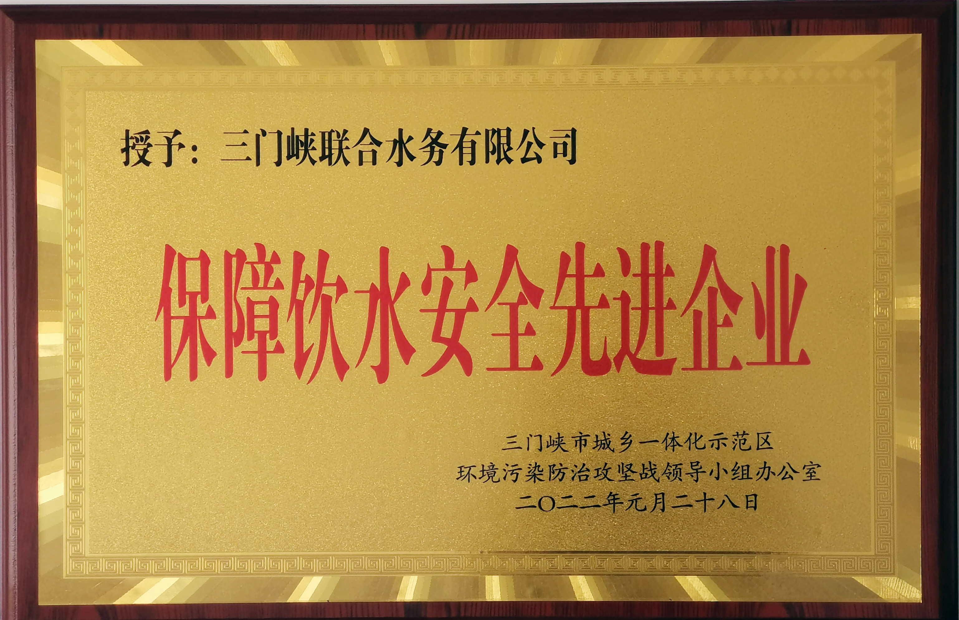 深耕細作篤前行,初心不改終有成。2月14日,一塊金燦燦的榮譽獎牌出現在三門峽聯合水務有限公司會議室。三門峽聯合水務有限公司2021年度在飲用水安全工作方面表現優異,得到三門峽市城鄉一體化示范區環境污染防治攻堅戰領導小組辦公室的肯定,被授予“保障飲水安全先進企業”榮譽稱號。