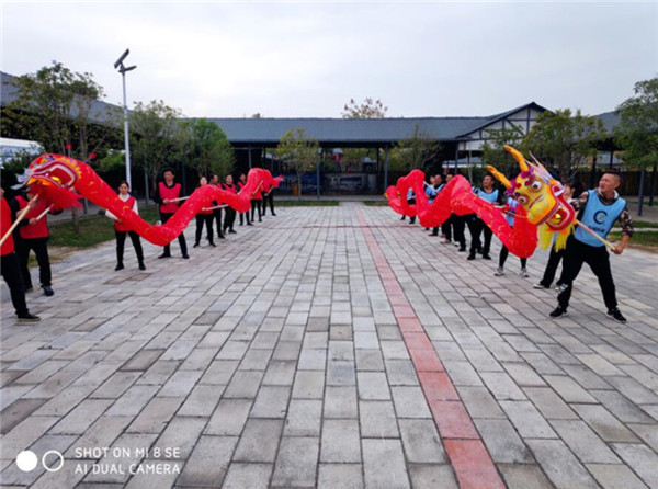 圖/ “鼓動人心”活動現(xiàn)場 最后一個項(xiàng)目是“龍騰盛世”。所有人齊心協(xié)力將零件組裝成一條活靈活現(xiàn)的龍,并在教練的指導(dǎo)下完成龍騰四海、盤龍?jiān)坪<坝锡垜蛩齻動作。這是一個大型創(chuàng)作類項(xiàng)目,趣味性和團(tuán)隊(duì)合作性極強(qiáng)。大家各司其職,制作龍骨、畫龍鱗、粘龍頭龍尾,不到一刻鐘的時間,兩條游龍就制作完成。在舞龍環(huán)節(jié),大家專心聽、用心舞,兩隊(duì)的舞龍動作都得到了教練的高度贊揚(yáng)。最后,在教練“風(fēng)水越來越順、生活越來越好”的祝福中結(jié)束了愉快而充實(shí)的團(tuán)建拓展活動。